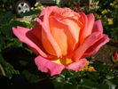 Hybrid Tea. Pink blend. Flowers phlox-pink, base canary-yellow,. Mild fragrance. Very large, full (26-40 petals), borne mostly solitary, cupped bloom form. Blooms in flushes throughout the season. USDA zone 7b and warmer. Height of 4½' to 6' 7" (135 to 200 cm). Stanley C. Johnston (1960).