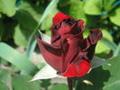 Climber, Hybrid Tea, Cl., Large-Flowered Climber.  Dark red.  Red filaments.  Strong fragrance.  Very large, full (26-40 petals), cupped-to-flat bloom form.  Blooms in flushes throughout the season.  USDA zone 6b through 9b (default).  Height of 12' to 14' (365 to 425 cm).   Michele Malandrone (1958).