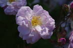 Floribunda, Hybrid Hulthemia persica. Lilac - pink, purple center. Mild to strong fragrance. Medium to large, semi-double to double, cluster-flowered, in small clusters, cupped bloom form. Blooms in flushes throughout the season. Height of up to 4' 7" (up to 140 cm). Width of up to 32" (up to 80 cm). Peter J. James (2004).