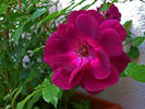 Floribunda. Deep purple with lighter reverse, dark burgundy red stamens and anthers. Full (26-40 petals), cluster-flowered, in small clusters, cupped-to-flat bloom form. Blooms in flushes throughout the season. USDA zone 6b through 9b (default). Height: 30" to 35" (75 to 90cm). Width: 31" to 39" (80 to 100cm). Edgar Norman Swane (1998).