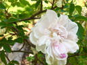 Damask Perpetual, Hybrid Spinosissima. White, light pink shading. [Light pink.]. Moderate fragrance. Medium to large, very full (41+ petals), flat bloom form. Occasional repeat later in the season. USDA zone 3b through 9b. Height of 6' to 8' (185 to 245 cm). James Lee (1821).