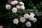 Shrub. English Rose Collection. Blush, cream edges, ages to white . Moderate, opinions vary fragrance. Medium to large, very full (41+ petals), borne mostly solitary, cluster-flowered, in small clusters, cupped, rosette bloom form. Blooms in flushes throughout the season. USDA zone 5b through 10b. Height of 3' to 5' (90 to 150 cm). Width of 30" to 4' (75 to 120 cm). David C. H. Austin (1926-2018) (1989).