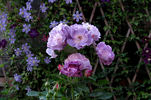 Floribunda. Lilac, lighter reverse, ages to blue . A true old purple, with a blush to white centre,. None to mild, opinions vary fragrance. Medium to large, semi-double to double, in large clusters, cupped bloom form. Blooms in flushes throughout the season. USDA zone 6b through 9b (default). Height: 35" to 6'7" (90 to 200cm). Width: 47" (120cm). Peter J. James (2001).