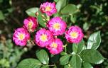 Climber, Shrub. Pink blend, white center. Strong, musk fragrance. Small, single (4-8 petals), cluster-flowered, flat bloom form. Prolific, continuous (perpetual) bloom throughout the season. Height of up to 7' (up to 215 cm). Warren Millington (2013).