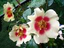 Floribunda, Hybrid Hulthemia persica, Shrub. Light yellow, red flecks, orange shading, ages to cream . Mild fragrance. Medium, single (4-8 petals), borne mostly solitary, in small clusters bloom form. Blooms in flushes throughout the season. Height: 28" to 35" (70 to 90cm). Width: 1' to 19" (30 to 50cm). Christopher H. Warner (2006).