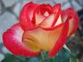 Floribunda / Cluster Flowered. Pink and white, red edges, yellow center. None to mild fragrance. Very large, very double, borne mostly solitary, in small clusters, high-centered bloom form. Blooms in flushes throughout the season. USDA zone 6b through 9b (default). Height of 2' to 39" (60 to 100 cm). Width of 20" to 2' (50 to 60 cm). Michel Adam (2005).
